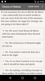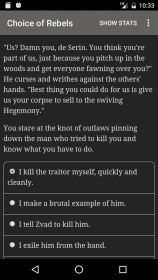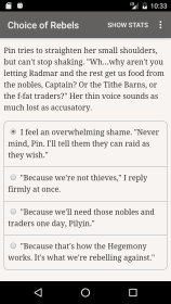 В мире, где Гегемония правит железной рукой, пришло время выступить против подпитываемой кровью магии, которую они практикуют. Игроки Choice of Rebels: Uprising могут взять на себя командование оборванной бандой преступников и превратить их в грозную армию повстанцев под их руководством. Автор, Джоэл Хейвенстон, ставит вас, читателя, в центр этого интерактивного фантастического романа из 637 000 слов и позволяет вашим решениям влиять на ход истории и ее завершение. Поскольку здесь нет визуальных или звуковых эффектов, это текстовое приключение зависит исключительно от творческих способностей игрока.