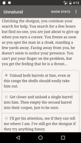 "Unnatural" использует силу вашего воображения, чтобы создать уникальный и погружающий опыт. Ваш выбор напрямую влияет на развитие сюжета, предлагая множество возможных исходов и заставляя принимать решения, которые могут спасти жизнь или привести к гибели. Каждое действие имеет последствия, и в этом мире, где ничто не является тем, чем кажется на первый взгляд, каждое решение может быть роковым. Эта игра — идеальный выбор для любителей жанра ужасов, которые готовы столкнуться лицом к лицу с темными силами, скрывающимися среди нас.