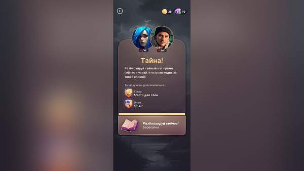 Примечание: В этот момент станет доступен Тайный чат для разблокировки. Сейчас эта возможность бесплатная, но в дальнейшем наверняка вам нужно будет заплатить определённое количество бриллиантов.