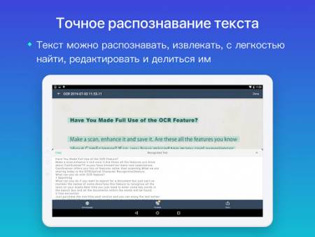 Приложение обеспечивает простоту в использовании, высокое качество сканирования, а также поддерживает оптическое распознавание символов (OCR) для текста на документах. Вы также можете синхронизировать свои сканированные файлы с облачными хранилищами для удобства доступа и хранения. CamScanner - это отличный инструмент для всех, кому нужно быстро и легко сканировать и оцифровывать документы с помощью смартфона.