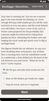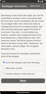 С помощью 210 000 слов и множества вариантов выбора, игра предлагает глубокое погружение в мир нелегального бизнеса. Каждое ваше решение будет иметь последствия, и именно вы решаете, как развивать свою империю. Работайте над созданием дистиллярии, устанавливайте связи с другими преступными группировками и избегайте властей, которые будут стремиться положить конец вашему бизнесу.