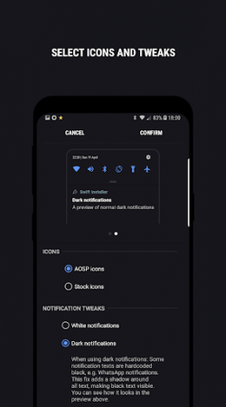 Swift Installer действительно отличается своей способностью полностью изменить внешний вид вашего устройства, придав ему новый стиль и индивидуальность. Это приложение предлагает широкий выбор различных изменений, начиная от панели уведомлений и значков приложений и заканчивая цветовыми темами.