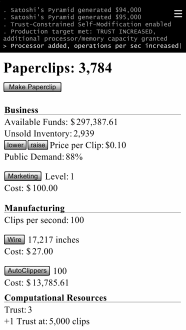 Но игра – это не только бесконечное нажатие кнопок. В Universal Paperclips скрыт интересный сюжет, который постепенно раскрывается по мере вашего продвижения, добавляя глубину и мотивацию к действию. Уникальный визуальный стиль, оригинальность и нестандартный подход к жанру делают этот кликер настоящим интригующим развлечением для геймеров, которые ищут нечто большее, чем просто очередное нажатие кнопки.