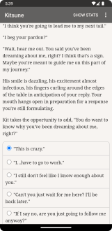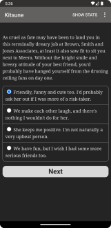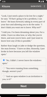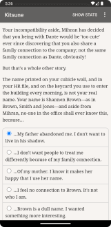 Kitsune — это не просто текстовая новелла, это медленное погружение в мир, где грань между реальностью и фантазией стирается. Ты живёшь серой, тихой жизнью: скучная работа, одиночество, проблемы, которые никуда не уходят. Единственное, что выбивается из рутины — повторяющийся сон о незнакомце. Но однажды он становится реальным. Он ранен, он в твоей квартире, и он просит помощи. С этого момента всё меняется — и назад дороги нет.