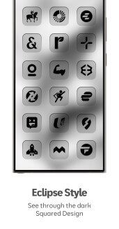 Eclipse Transparent Icon Pack — это стильный набор иконок с тёмными полупрозрачными квадратами и аморфными чёрными символами. Каждые пять минут ты можешь освежать внешний вид экрана — иконки не конфликтуют с фоном, выглядят аккуратно как на ярких обоях, так и на полностью чёрных. Стиль минималистичный, с уклоном в современный дизайн: всё на своих местах, ничего лишнего.