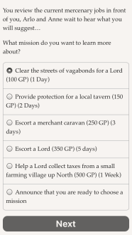 Life of a Mercenary — это интерактивный фэнтезийный текстовый роман, где ты берёшь на себя роль командира наёмников. Каждые 5 минут — новый контракт, дилемма, сражение или предательство. Ты можешь защищать королевства, шпионить для мятежников или просто следовать за золотом, не задавая лишних вопросов. История разворачивается в эпоху Великого турнира, но ты сам решаешь, кем станешь в этом мире — героем, убийцей или кем-то посередине.