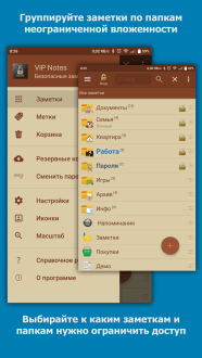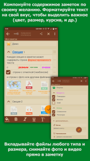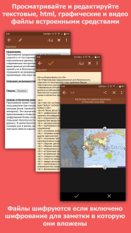 Собирай записи по папкам, прикрепляй к ним любые файлы — текст, HTML, PDF, фото, даже видео — и открывай их сразу внутри приложения. Виджеты на рабочем столе и ярлыки на вложения экономят секунды, а гибкий редактор подчёркивает, выделяет и форматирует слова. Добавляй свои иконки, меняй десять цветовых тем, сортируй заметки, работай офлайн. Установи приложение, попробуй и пойми, насколько проще жить, когда всё нужное лежит в зашифрованном порядке.
