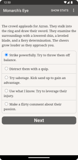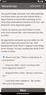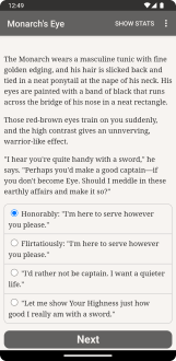 Games of the Monarch's Eye — интерактивный фэнтезийный роман в стиле «шёлк и колдовство» от Саффрон Куо. Здесь нет картинок или звуков — только сотни вариантов ответа, тысячи слов и безграничная сила твоего воображения. После десятилетия изгнания ты возвращаешься в город Варз, чтобы сразиться за титул Ока Монарха в грандиозном турнире Интеллекта, Сердца и Мощи.