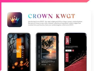 Crown KWGT — это пачка виджетов для KWGT где ты превращаешь экран в уникальный дизайн. Ты держишь телефон открываешь Nova Launcher и добавляешь виджет на рабочий стол. За пять минут ты выбираешь часы из коллекции тапаешь чтобы настроить цвет и размер — один свайп и погода появляется с градиентом а музыка показывает обложку трека. Ты листаешь варианты от минималистичных до ярких и вот экран оживает с твоим стилем заставляя перетасовывать иконки.