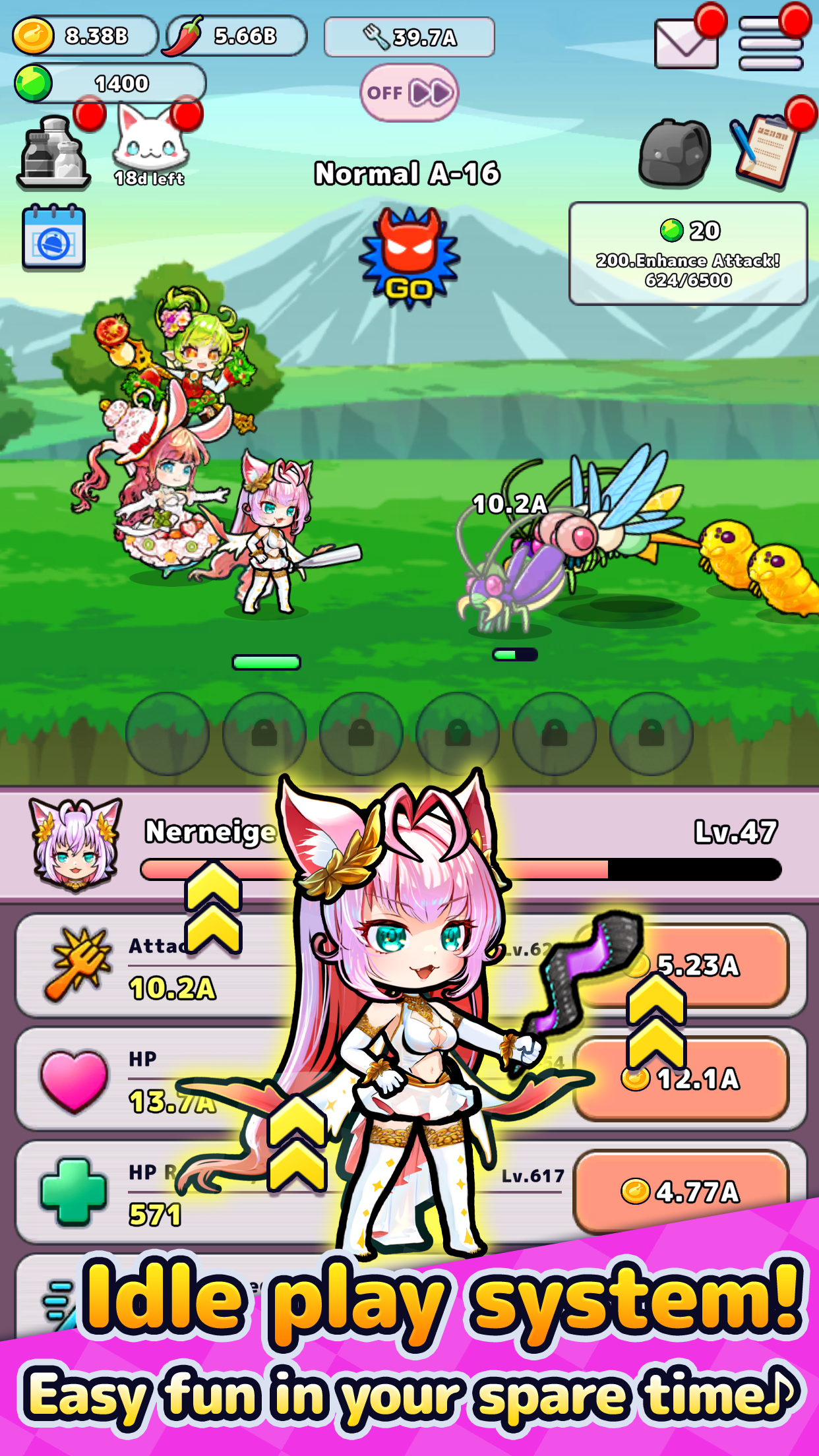 Snacky Girls! – idle RPG в милом фэнтези-мире, где ты тренируешь прекрасных персонажей, побеждаешь монстров в автоматических боях. Ты прокачиваешь героинь, комбинируешь навыки для комбо, наслаждаешься стратегическим развитием. За недолгий отрезок ты усиливаешь атаку девушки суперударом, запускаешь автобой с ордой гоблинов, собираешь ресурсы с поверженных. Каждое улучшение усиливает команду, а экран оживает – навыки вспыхивают, монстры разлетаются. Сцены полны азарта, как момент, когда твоя героиня разрывает дракона огненным шквалом, или фарм лута в тихом лесу. Ты чувствуешь себя создателем непобедимой армии.