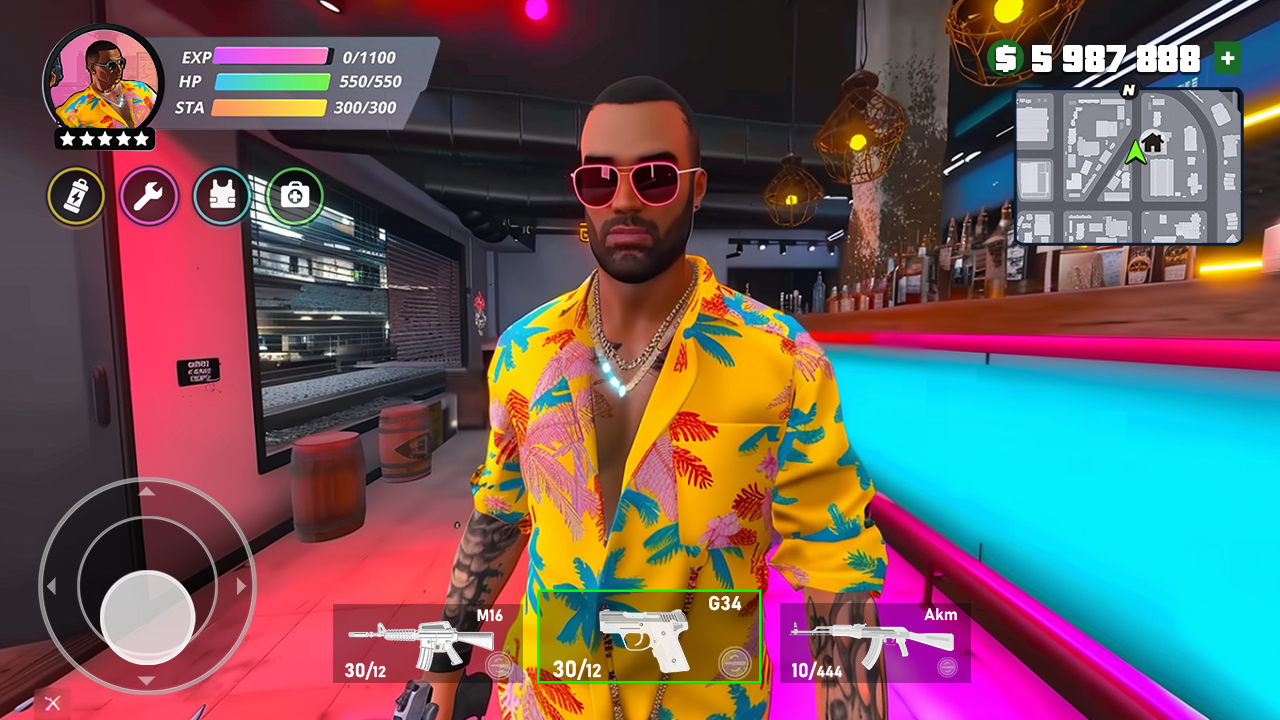 Master Grand Crime Game – экшен-симулятор преступной жизни в открытом мире, вдохновленном Вегасом, где ты становишься гангстером, угоняешь тачки, сражаешься с мафией. Ты управляешь героем, выполняешь миссии, грабишь банки, уходишь от погонь. За недолгий отрезок ты садишься в спорткар на улице, мчишься по бульвару, стреляешь по конкурентам из окна, или прячешься в переулке от копов. Каждое действие приносит деньги, а город меняется – улицы гудят сиренами, толпы разбегаются. Сцены полны хаоса, как прорыв через блокпост под градом пуль или сделка с боссом в ночном клубе. Ты чувствуешь себя королём преступного мира, где власть завоёвывается силой.