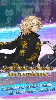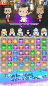 Tokyo Revengers PUZZ REVE! — это match-3 головоломка где ты собираешь команду из героев манги в мире уличных банд Токио. Ты тапаешь по плиткам с символами чтобы собрать три в ряд и активировать комбо-атаки. За пять минут ты соединяешь иконки Mikey или Draken смотришь как они рубят гангстеров — один взрывный матч и волна преступников разлетается с криками а твоя банда набирает силу. Ты планируешь ходы чтобы усилить скиллы и вот следующий уровень открывает новые улицы с боссами.