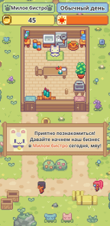 Meow Bistro! — это симулятор кафе в мире милых котиков где ты открываешь своё заведение на оживлённой улочке. Ты просыпаешься с первыми лучами заходишь на рынок торгуешься за рыбу и овощи. За пять минут ты нарезаешь ингредиенты жаришь на сковороде и подаёшь первому клиенту — один удачный заказ и кошелёк звенит монетами а довольный гость оставляет чаевые. Ты экспериментируешь с рецептами чтобы удивить следующего и вот запах мяса тянет новых посетителей.