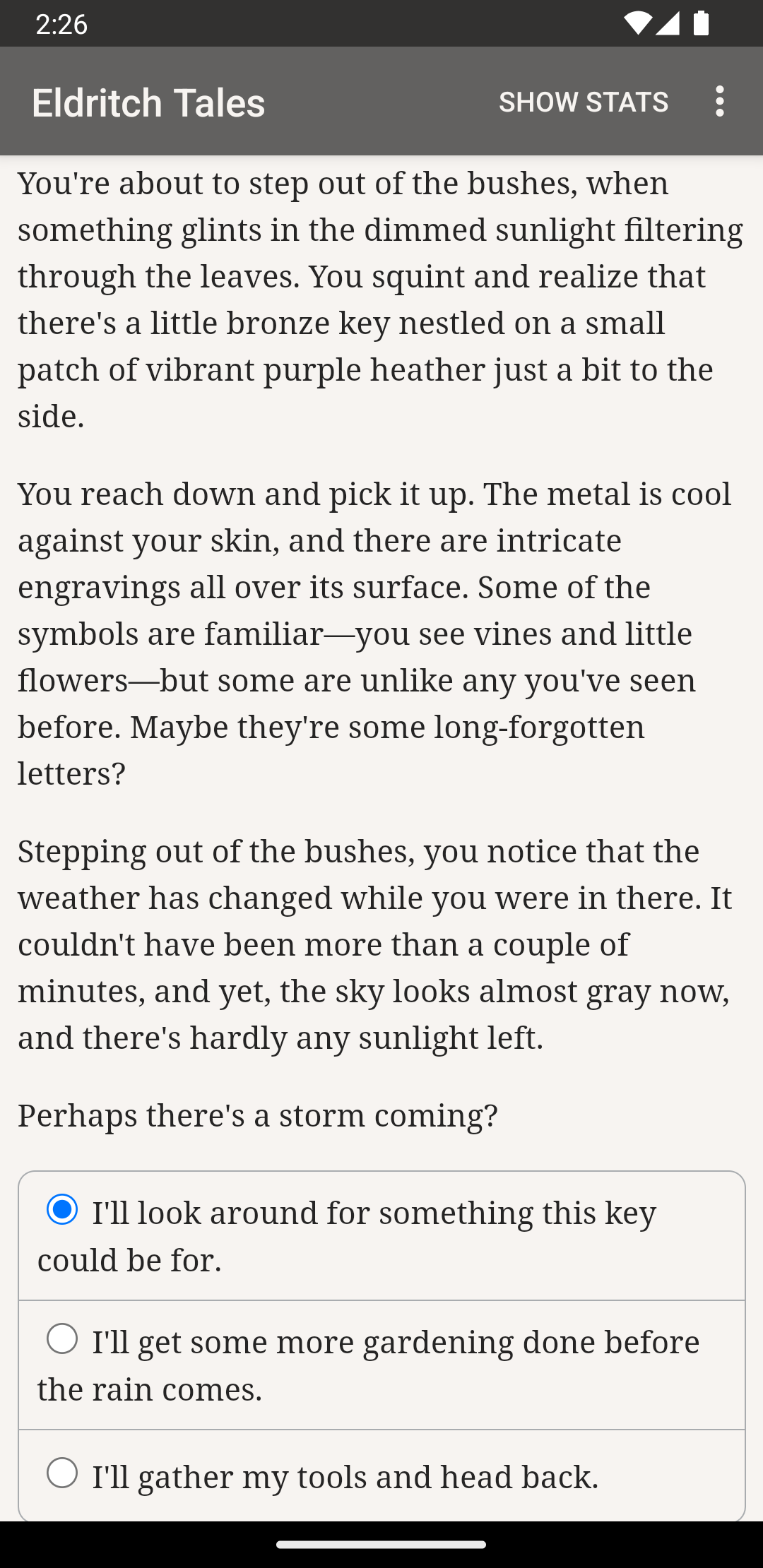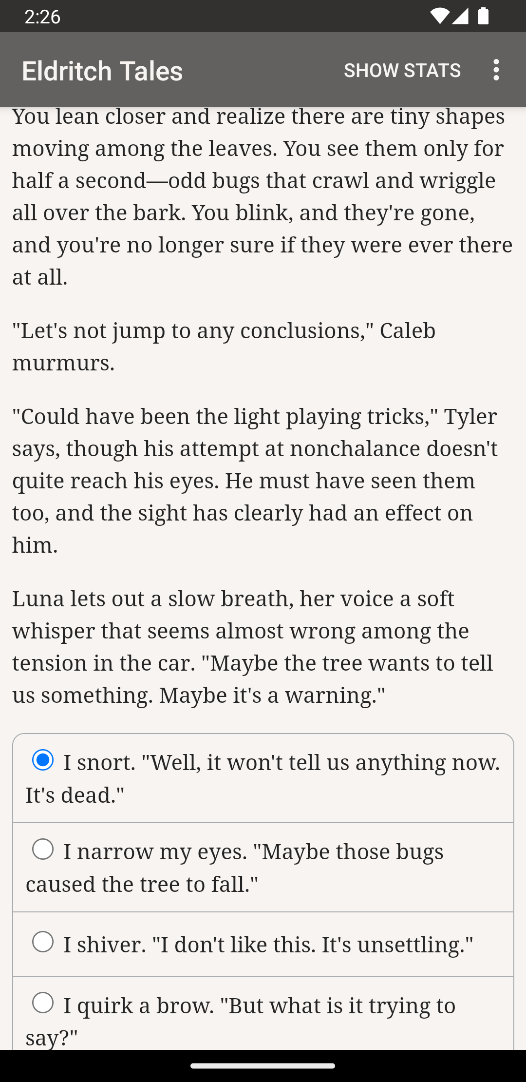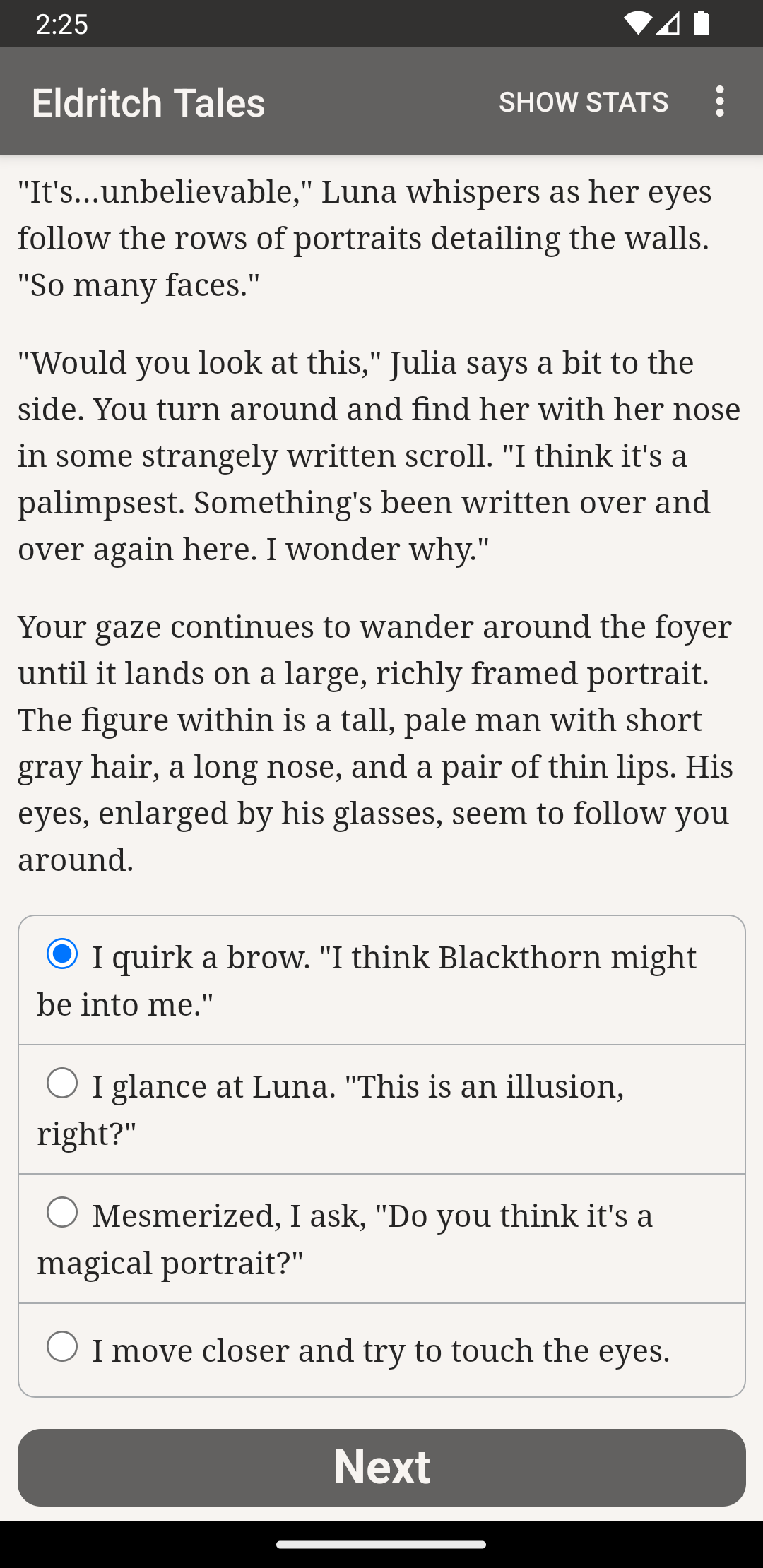 Eldritch Tales: Inheritance – интерактивный роман ужасов, где ты, наследник семьи, прибываешь в особняк Блэкторн и сталкиваешься с странными событиями, такими как самодвижущиеся тени и неестественно тёмные ночи. Ты исследуешь коридоры, разгадываешь загадки, общаешься со спутниками, чтобы доверять им или подозревать, ищешь разгадку тайн дома. За недолгий отрезок ты осматриваешь пыльный чердак, находишь дневник с жуткими записями, решаешь, показать ли его другу в библиотеке, или прячешь от всех в своей комнате. Каждое открытие нагнетает страх, а особняк реагирует живо – двери хлопают, шепот эхом отзывается. Сцены полны жути, как момент, когда тень оживает в зеркале под луной, или внезапный крик в подвале, где что-то шевелится в темноте. Ты чувствуешь себя в ловушке разума.
