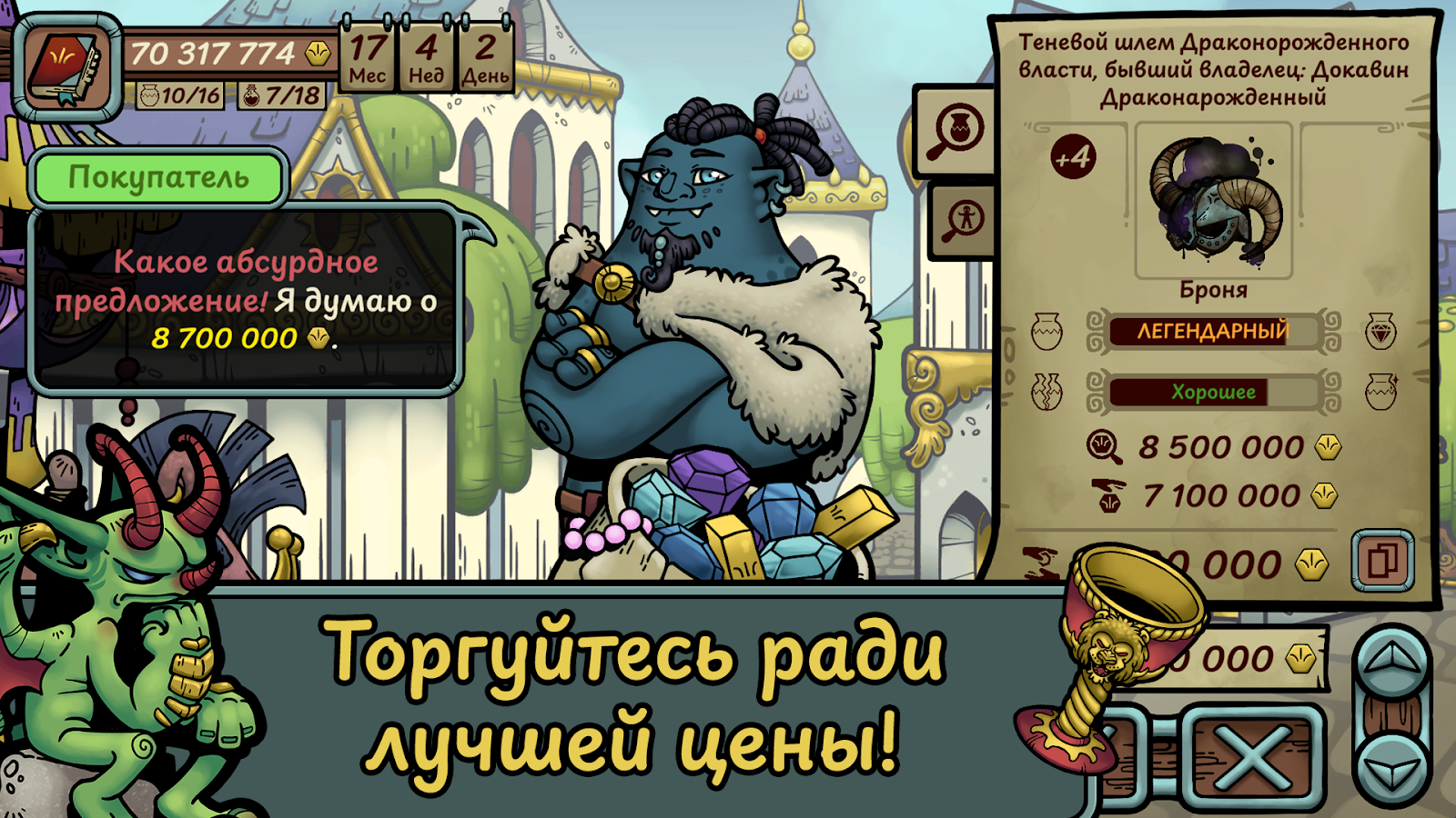Dealer's Life Legend – симулятор торговли в фэнтезийном мире Пекунийской империи, где ты путешествуешь между городами расширяешь ассортимент товаров накапливаешь богатства через удачные сделки. Ты изучаешь клиента за прилавком в шумной таверне предлагаешь цену за редкий артефакт торгуешься до выгодного соглашения или отказываешь подозрительному покупателю в переулке. Каждое решение формирует репутацию а империя оживает – караваны прибывают рынки гудят. Сцены полны азарта как момент когда ты убеждаешь лорда купить доспехи в зале замка или находишь уникальный предмет на аукционе в порту под крики торговцев. Ты чувствуешь себя мастером сделок где каждая монета приближает к успеху.