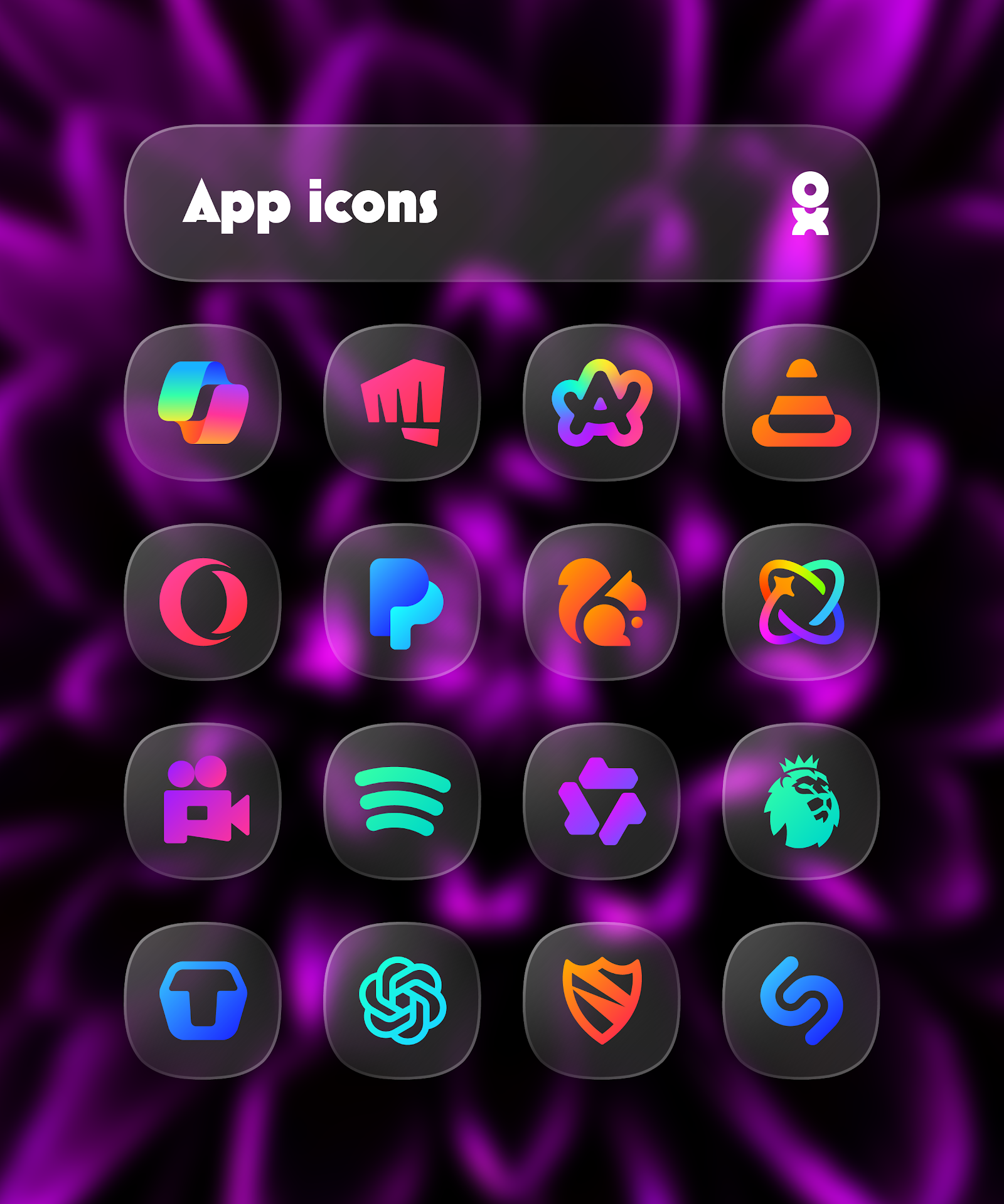 One UI Glass Color Icon Pack — пачка иконок для Android в стеклянном стиле с цветными квадратами и минималистичными контурами. Ты открываешь Nova Launcher применяешь тему и видишь как галерея оживает прозрачным блоком с лёгким бликом — она переливается на обоях. За пять минут ты листаешь каталог выбираешь вариант для сообщений и жмёшь применить — иконка ложится с градиентом а гармония цветов подстраивается под интерфейс. Ты зумишь на край чтобы поймать чистоту и вот экран дышит элегантностью — один свайп по лаунчеру и всё течёт гладко, заставляя переставить виджеты для баланса.