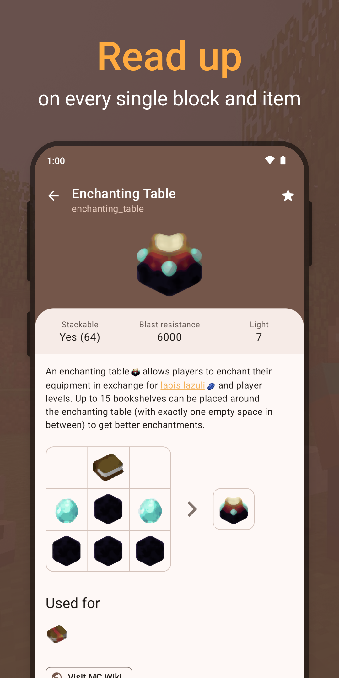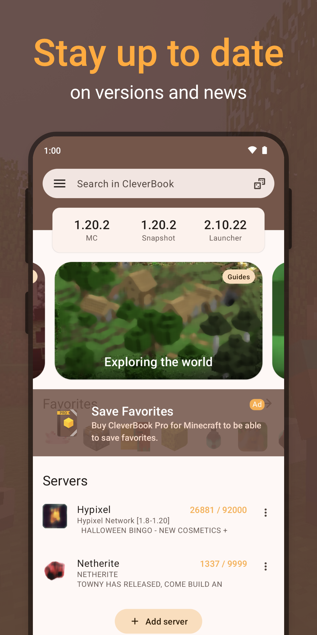 CleverBook – справочник по популярной игре на выживание, где ты получаешь быстрый доступ к информации о блоках рецептах мобах и многом другом. Ты создаёшь персонажа в кубическом мире, ищешь данные о диаманте в шахте, фильтруешь чары для меча в кузнице, проверяешь биомы для строительства в лесу. За недолгий отрезок ты открываешь приложение в тихой комнате, ищешь рецепт алмазной брони в меню, фильтруешь мобы по силе для охоты. Каждое открытие помогает выживанию, а интерфейс оживает – данные появляются, фильтры сужают поиск. Сцены полны открытий, как момент когда ты находишь команду для телепорта в подземелье под вспышками молний или список достижений в деревне с жителями.