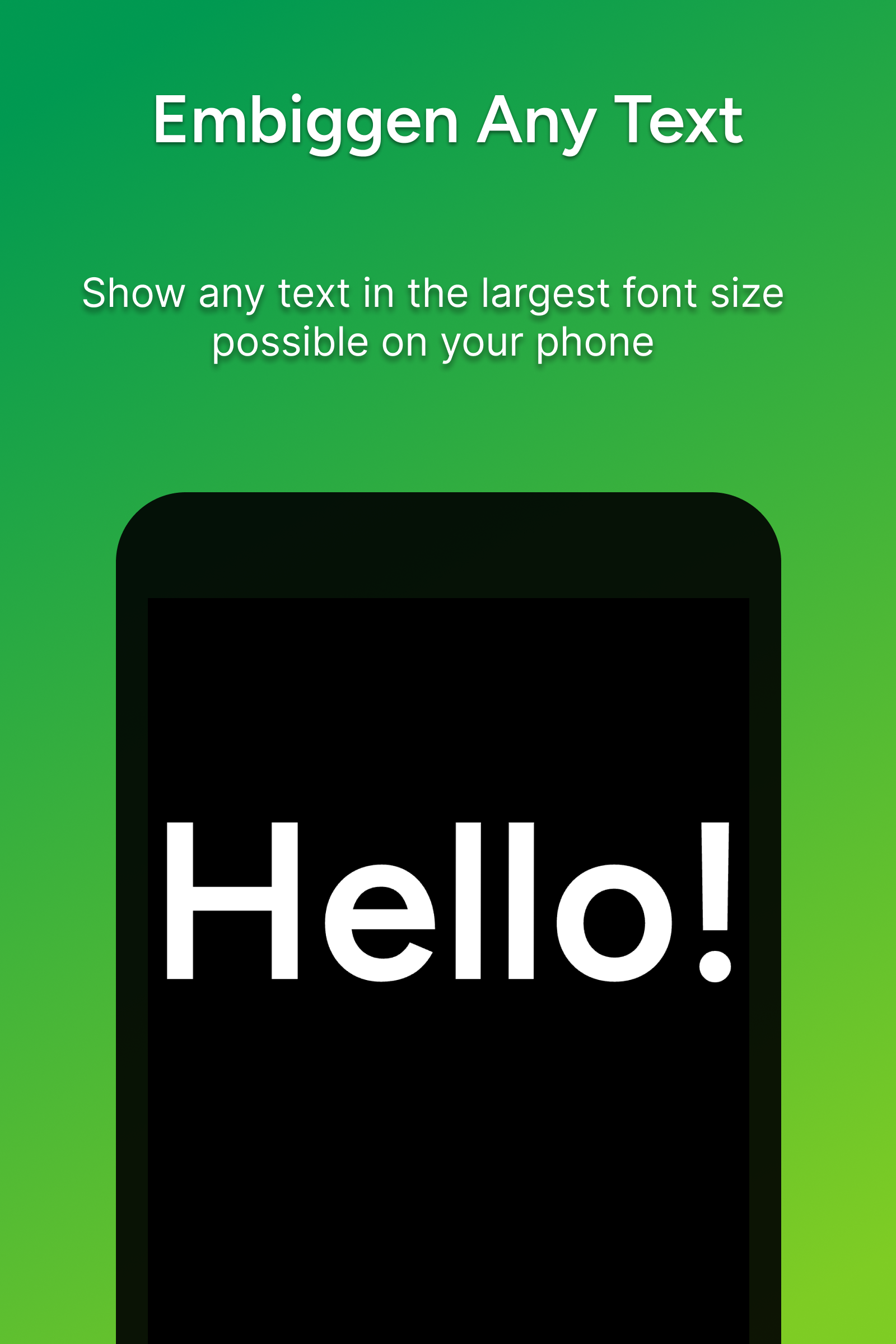 Giga Text: Embiggen Large Text — чат-приложение где ты показываешь огромные буквы на экране чтобы передать сообщение без слов. Ты открываешь экран вводишь "Я в порядке" и жмёшь кнопку — шрифт разрастается до предела заполняя дисплей. За пять минут ты меняешь цвет на зелёный для фона и синий для букв — текст всплывает ярко а история сохраняет комбо. Ты тапаешь на старое "Где ты?" и оно оживает теми же оттенками — один свайп в инкогнито и следы стираются без следа. Ты передаёшь фразу "Встретимся у парка" через стекло машины и видишь кивок в ответ.