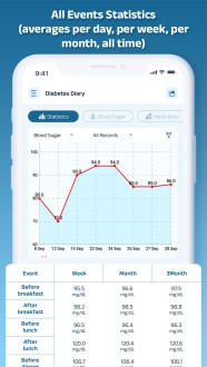 Diabetes Diary, Blood Glucose — трекер здоровья где ты фиксируешь уровень глюкозы после укола и видишь график изменений. Ты открываешь приложение вводишь 5.5 ммоль/л после завтрака и жмёшь сохранить — линия кривой поднимается плавно. За пару минут ты добавляешь давление 120/80 добавляешь вес и вот A1C подсчитывается автоматически — один свайп по дню и отчёт показывает тренд с пиками после ужина. Ты отмечаешь еду вроде булочки с чаем и чувствуешь как данные ложатся в картину чтобы скорректировать дозу инсулина.
