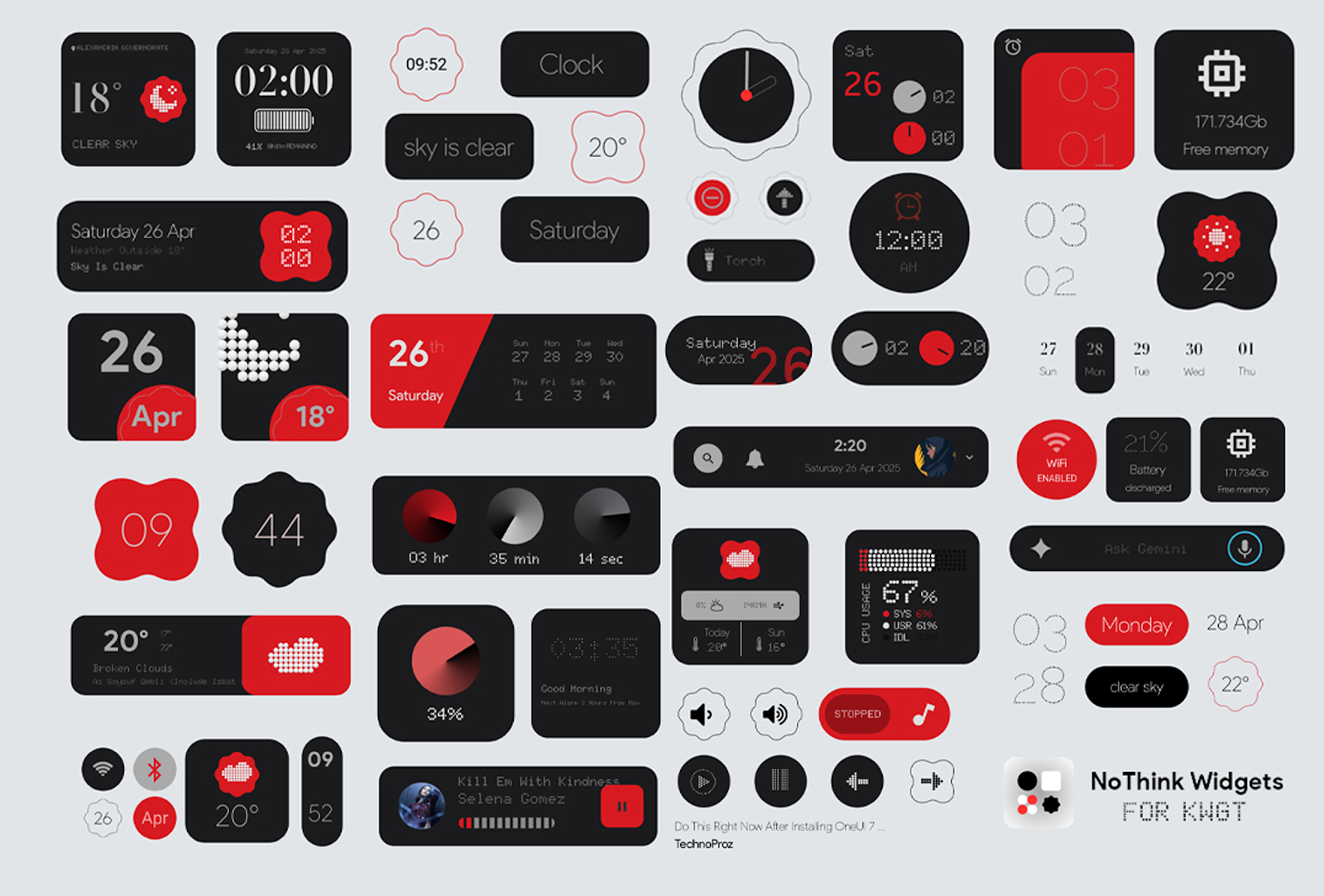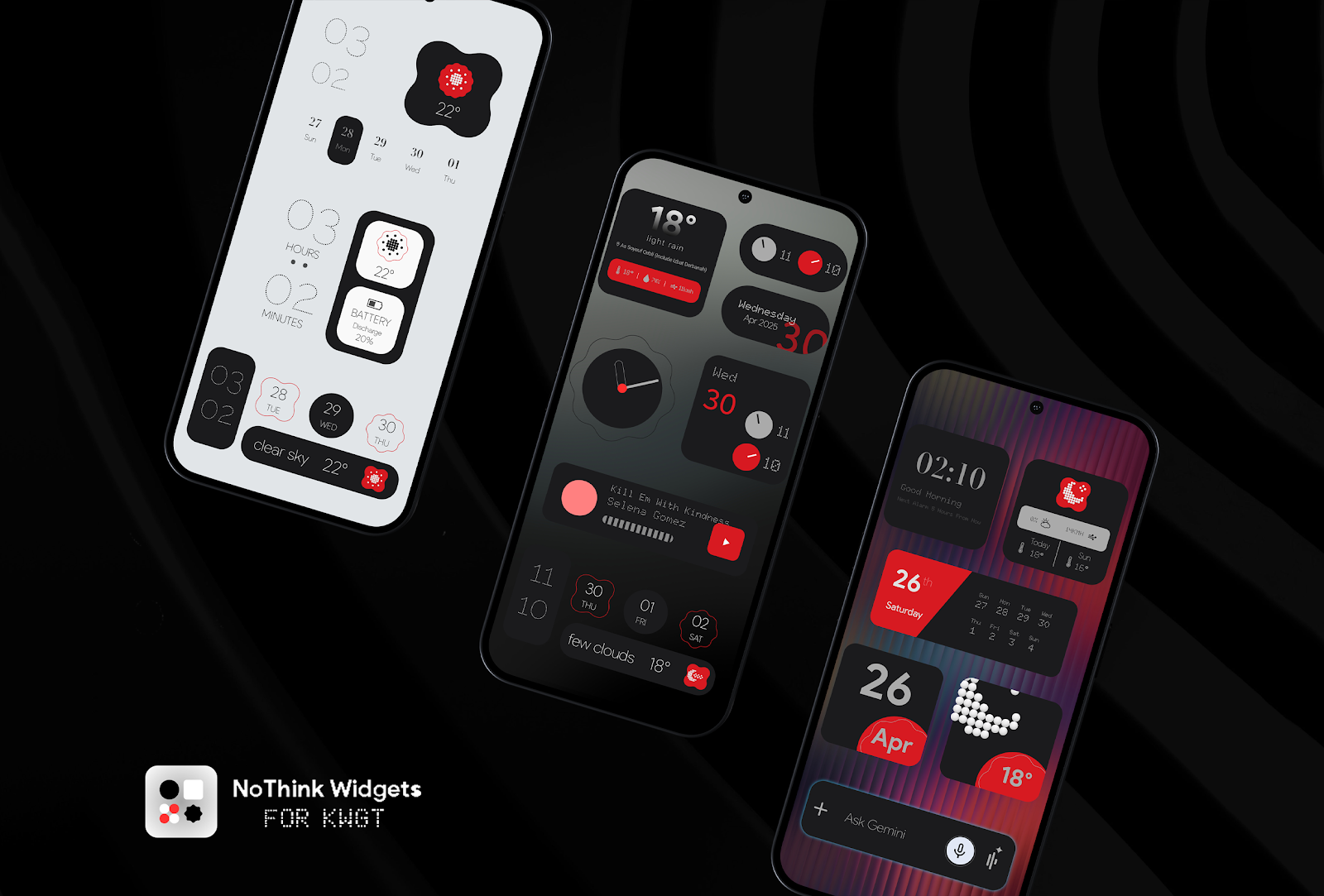 NoThink Widgets for KWGT — пачка модулей где ты превращаешь экран в футуристичный минимализм с плавными градиентами. Ты держишь телефон долго жмёшь на пустом месте добавляешь KWGT и вставляешь шаблон часов — цифры парят с лёгким свечением. За пять минут ты тянешь углы чтобы подогнать размер тапаешь на цвета и видишь как погода оживает — иконки облаков меняют оттенок под обои а текст теплеет без перегрузки. Ты переключаешь на календарь чувствуешь как баланс ложится на ладонь и вот стол дышит свободно.