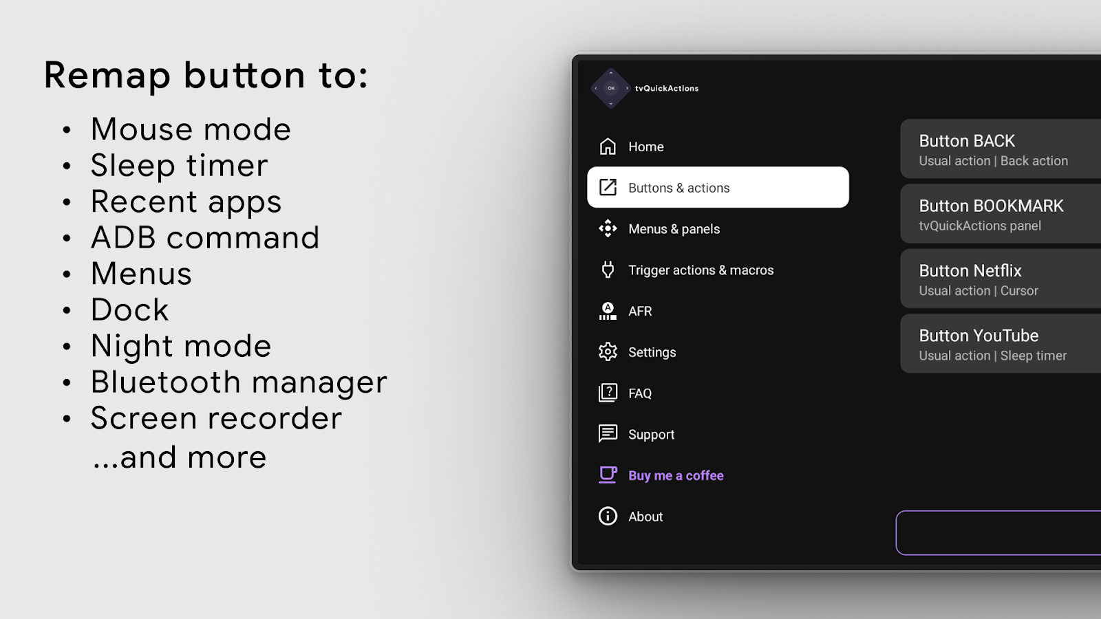 tvQuickActions – приложение для кастомизации кнопок пульта на Android TV, Google TV и AOSP-устройствах. Ты подключаешь смартфон по Wi-Fi или Bluetooth назначаешь до 5 действий на одну клавишу пульта от открытия YouTube до выключения экрана. В типичном использовании ты выбираешь кнопку Netflix меняешь её на Disney+ или панель приложений в стиле macOS добавляешь жесты на стрелки и видишь как пульт оживает под твои нужды. За пять минут ты можешь переназначить 3-4 клавиши протестировать на Netflix или Prime Video почувствовать свободу от заводских ограничений и ощутить как ТВ работает как ты хочешь. Это цепляет ведь управление с телефона мгновенное а поддержка разных брендов позволяет настроить несколько телевизоров одним устройством заставляя забыть про стандартные пульты.