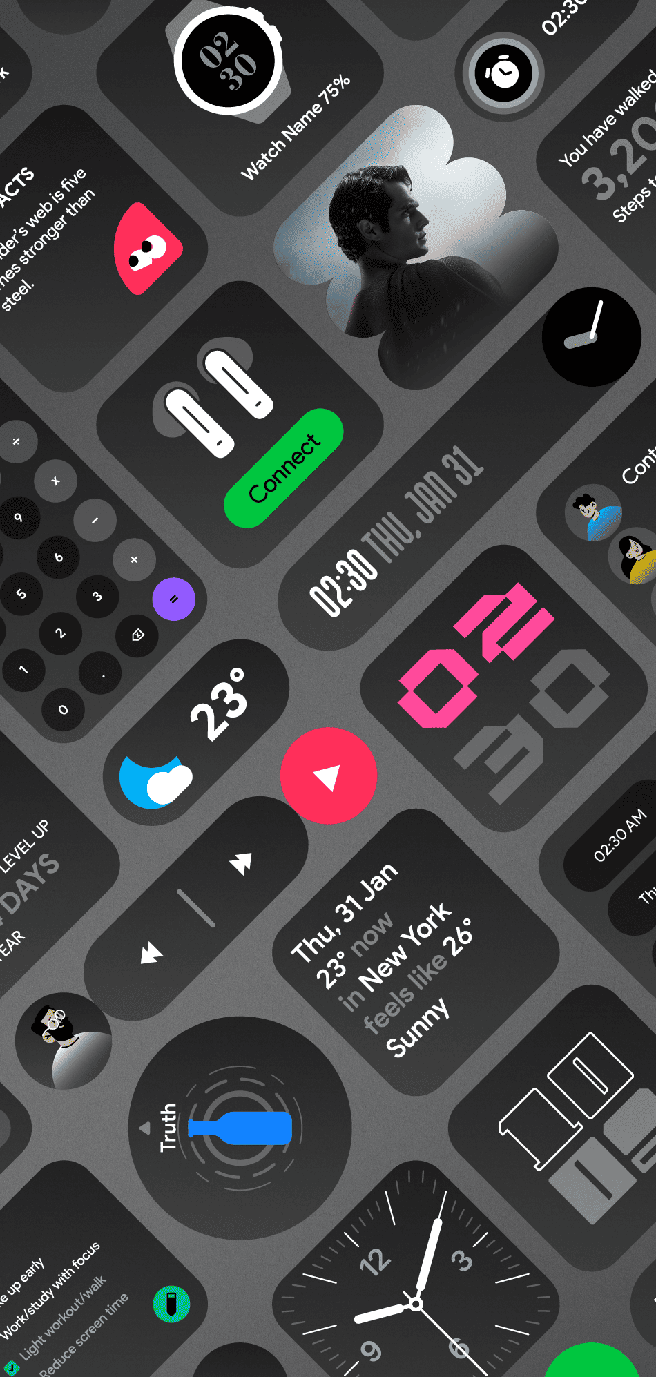Ты получаешь готовые виджеты без необходимости в KWGT или сложных пресетах где морфинг-стекло с прозрачностью идеально ложится на любые обои от чёрных до градиентов. Кастомизация позволяет менять цвета шрифты и размеры одним тапом а коллекция обновляется новыми стилями. Ты покрываешь весь экран от часов до плеера экспериментируешь комбо растешь от стандартного Android до полностью персонализированного минимализма и наслаждаешься простотой что даёт элегантность мгновенно. Попробуй сам и увидишь как тёмное стекло меняет весь вид телефона.