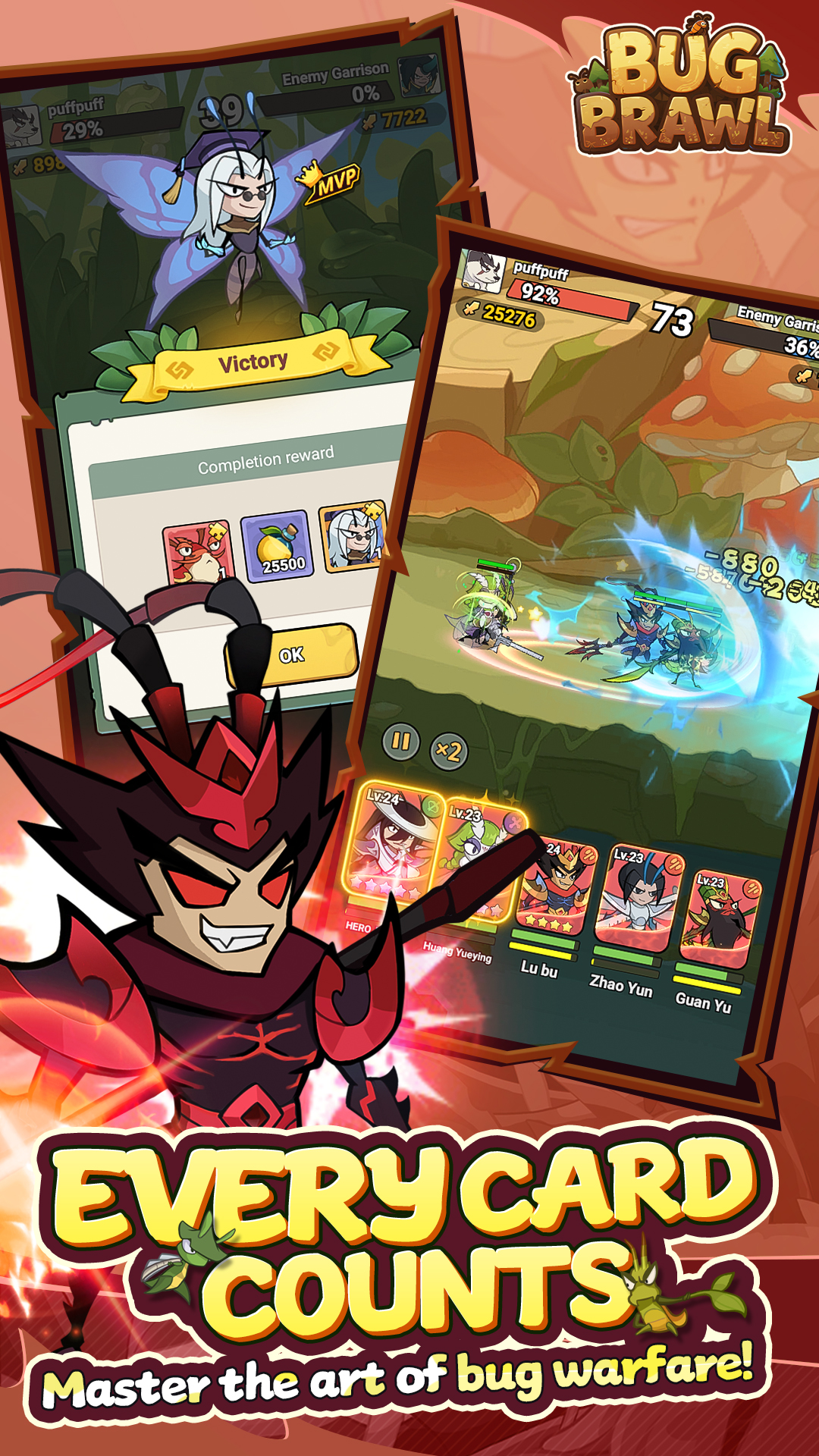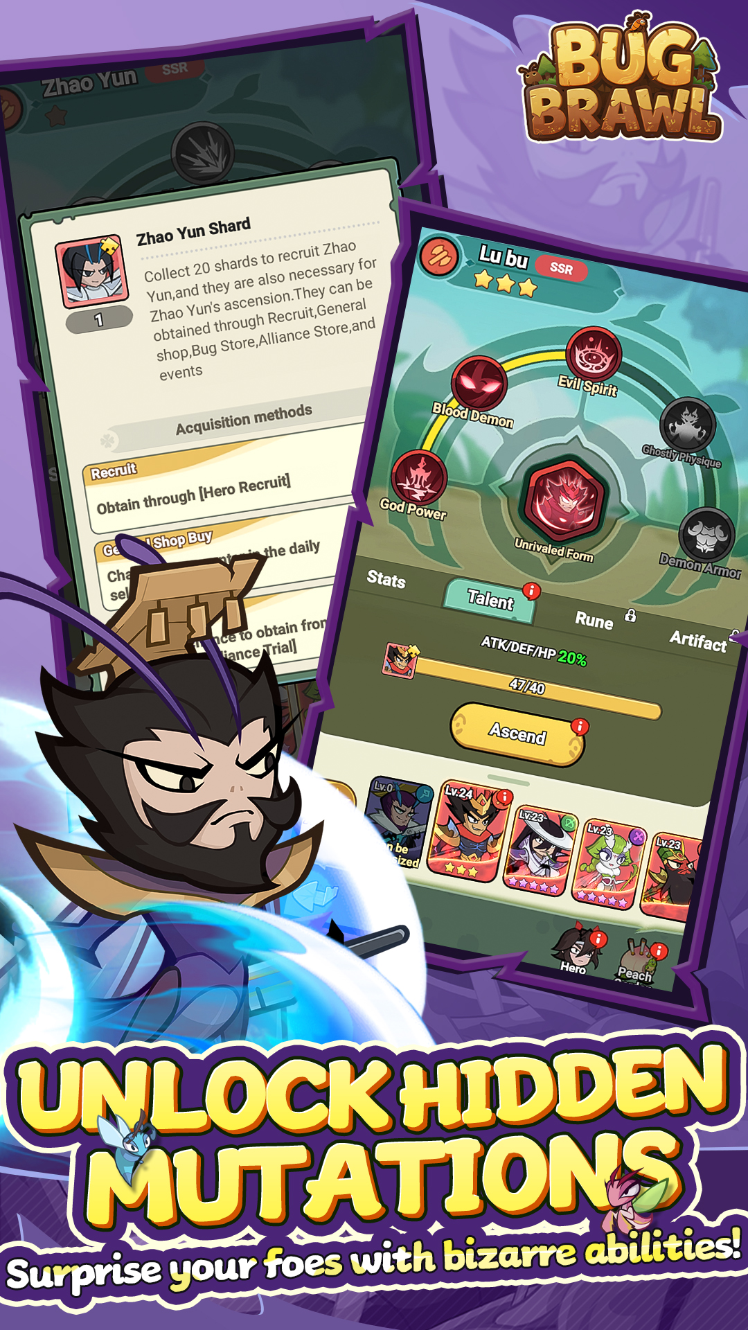 Bug Brawl — это увлекательная RPG в микроскопическом мире насекомых эпохи Троецарствия, где саранча Лю Бэй правит Империей Саранчи Хань, богомол Цао Цао — Легионом богомолов Вэй, жук Сунь Цюань — Бронированным королевством У, и ты объединяешь их для мира, развивая генералов-насекомых через многомерную культивацию — от навыков до звёздных улучшений, — получаешь редкие ресурсы оффлайн, создаёшь альянсы для кросс-серверных соревнований, исследуешь подземелья, сражаешься с врагами за ценные награды. Ты погружаешься в фэнтезийное приключение, ощущая эпос, где каждый апгрейд усиливает боевую мощь, а простота затягивает на часы прогресса, битв и социалки с друзьями, добавляя глубины через комбо и стратегии.