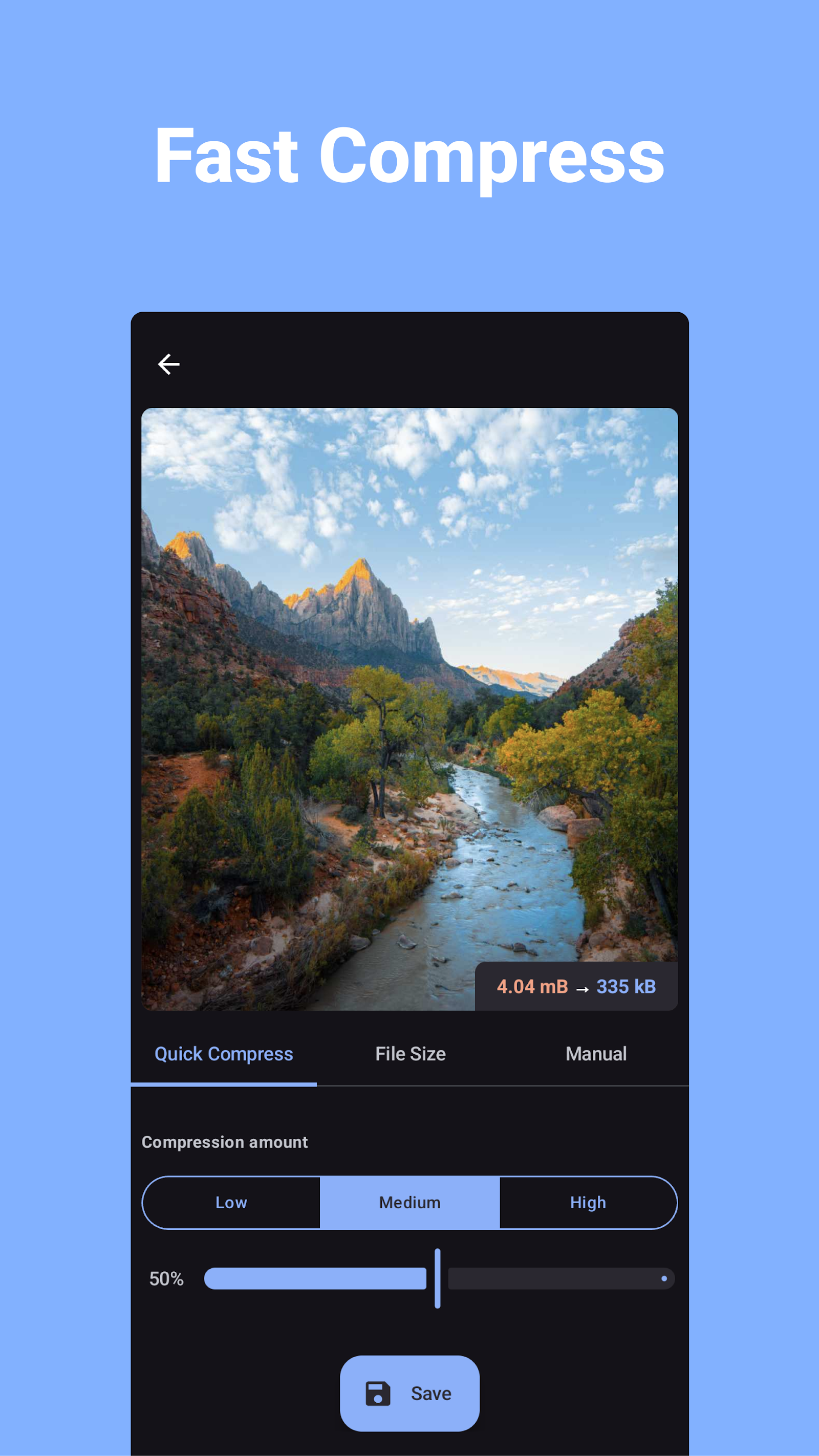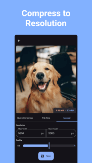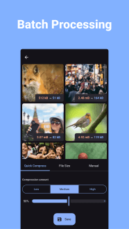 Compress Image - MB в KB – мощный компрессор изображений с пакетной обработкой. Ты выбираешь фото или целую папку устанавливаешь уровень сжатия от лёгкого до максимального запускаешь процесс и видишь как MB превращаются в KB без заметной потери качества. В типичном использовании ты берёшь 50 фото с отпуска сжимаешь их до 70% качества освобождаешь гигабайты места сохраняешь в галерею или делишься мгновенно. За пять минут ты можешь обработать альбом протестировать разные уровни увидеть статистику экономии и почувствовать как телефон дышит свободнее. Это цепляет ведь пакетная обработка ускоряет рутину а совместимость с JPG PNG и другими форматами делает инструмент универсальным заставляя возвращаться за чисткой библиотеки регулярно.