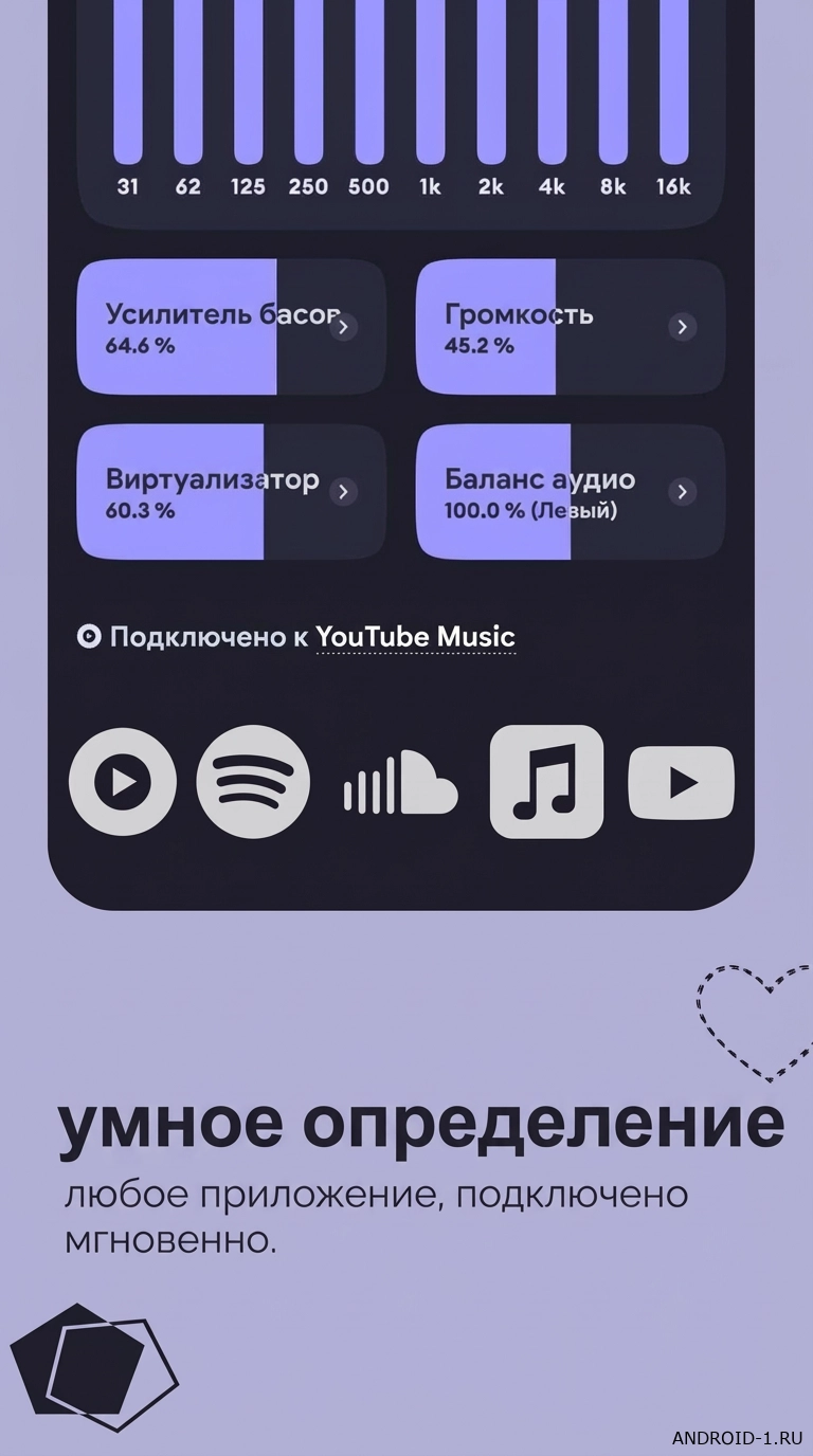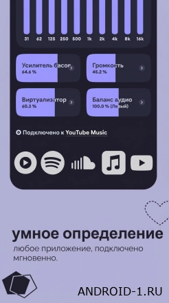 v6.5Echo Equalizer: Bass Booster — это удобное приложение для обработки и улучшения звука прямо на телефоне. Ты загружаешь музыкальный трек или аудиофайл и сразу видишь где есть проблемы с басом частотами или общим балансом. Приложение быстро анализирует дорожку предлагает рекомендации по исправлению и позволяет настроить эквалайзер под свои предпочтения. За несколько секунд ты можешь усилить басы убрать искажения или сделать звук более чистым и приятным.