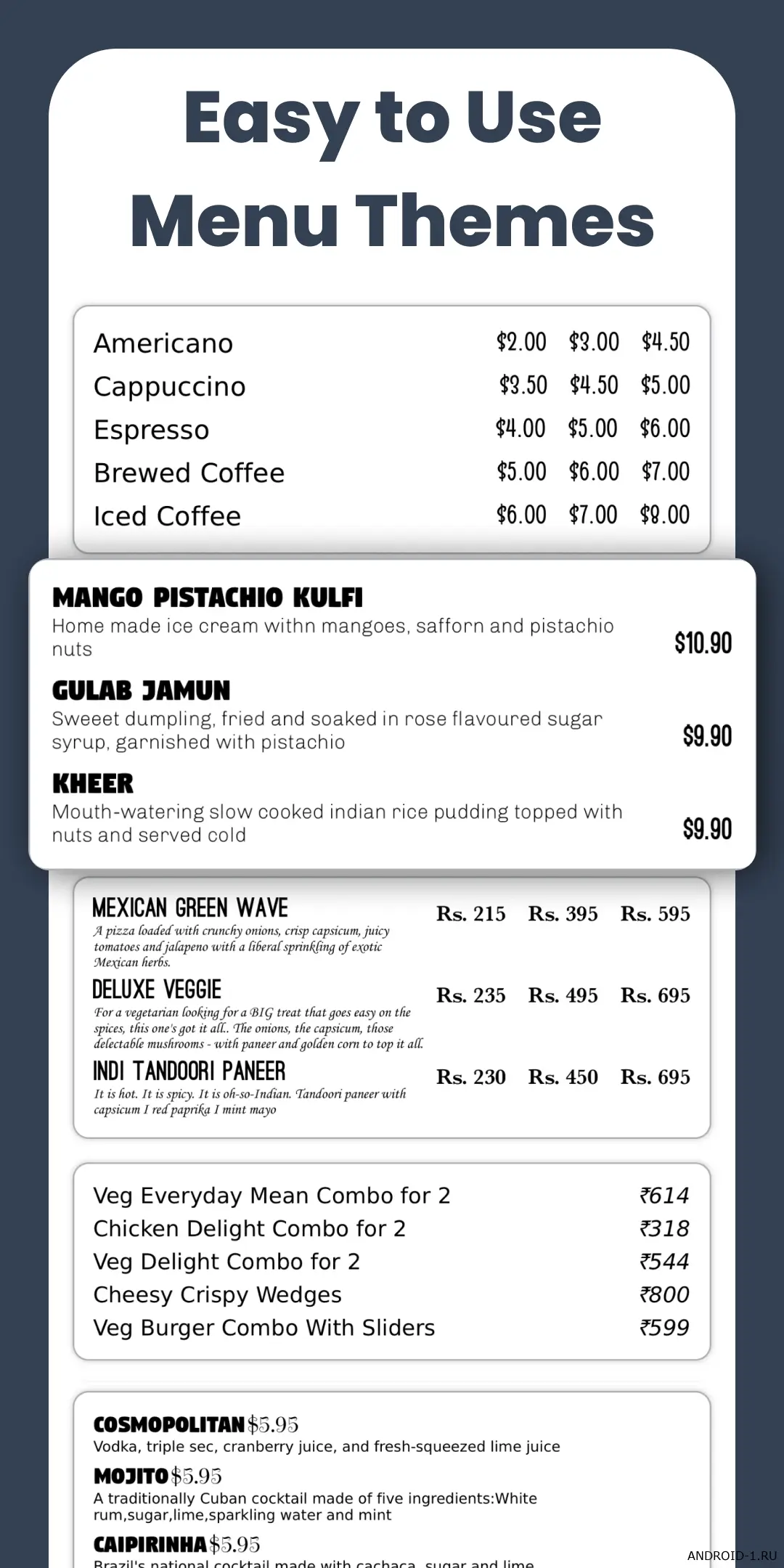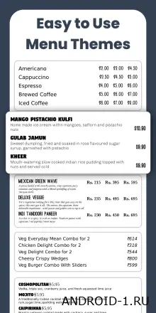 v70.0Menu Maker, Menu Templates — это удобный конструктор меню который помогает ресторанам и кафе создавать красивые и профессиональные меню. Ты выбираешь один из тысяч готовых шаблонов отсортированных по популярности и тематике и сразу начинаешь его настраивать под свой стиль. За пять минут ты можешь добавить блюда напитки цены изменить цвета шрифты и оформление чтобы меню полностью соответствовало бренду заведения.