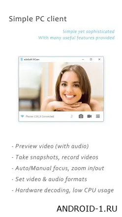 v7.4.0iVCam Webcam — это удобное приложение которое позволяет использовать камеру твоего телефона как полноценную веб-камеру без компьютера. Ты подключаешь устройство и сразу получаешь плавное видео высокого качества с чётким звуком. За пять минут ты можешь настроить камеру изменить яркость баланс белого и другие параметры и начать просмотр или трансляцию в Full HD.