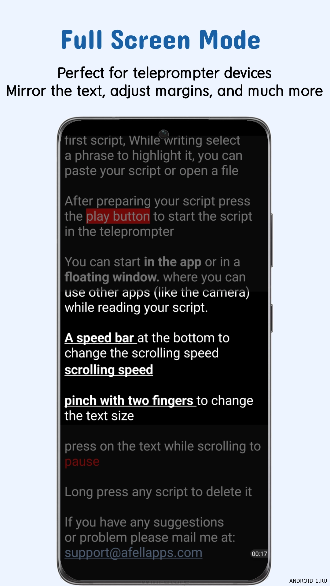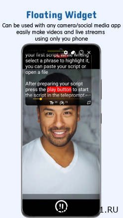 Ты используешь плавающий виджет который работает поверх любого приложения камеры и легко регулируешь его размер и положение в портретном или альбомном режиме. Это позволяет держать взгляд на камеру а не на экран и делает видео более живыми и профессиональными. Приложение даёт глубокую настройку текста и фона чтобы телесуфлер идеально подходил под твои нужды. Ты читаешь сценарий без запинок растешь в уверенности выступлений и наслаждаешься тем как твои видео и презентации стали гораздо лучше. Попробуй сам и почувствуй разницу в качестве речи.