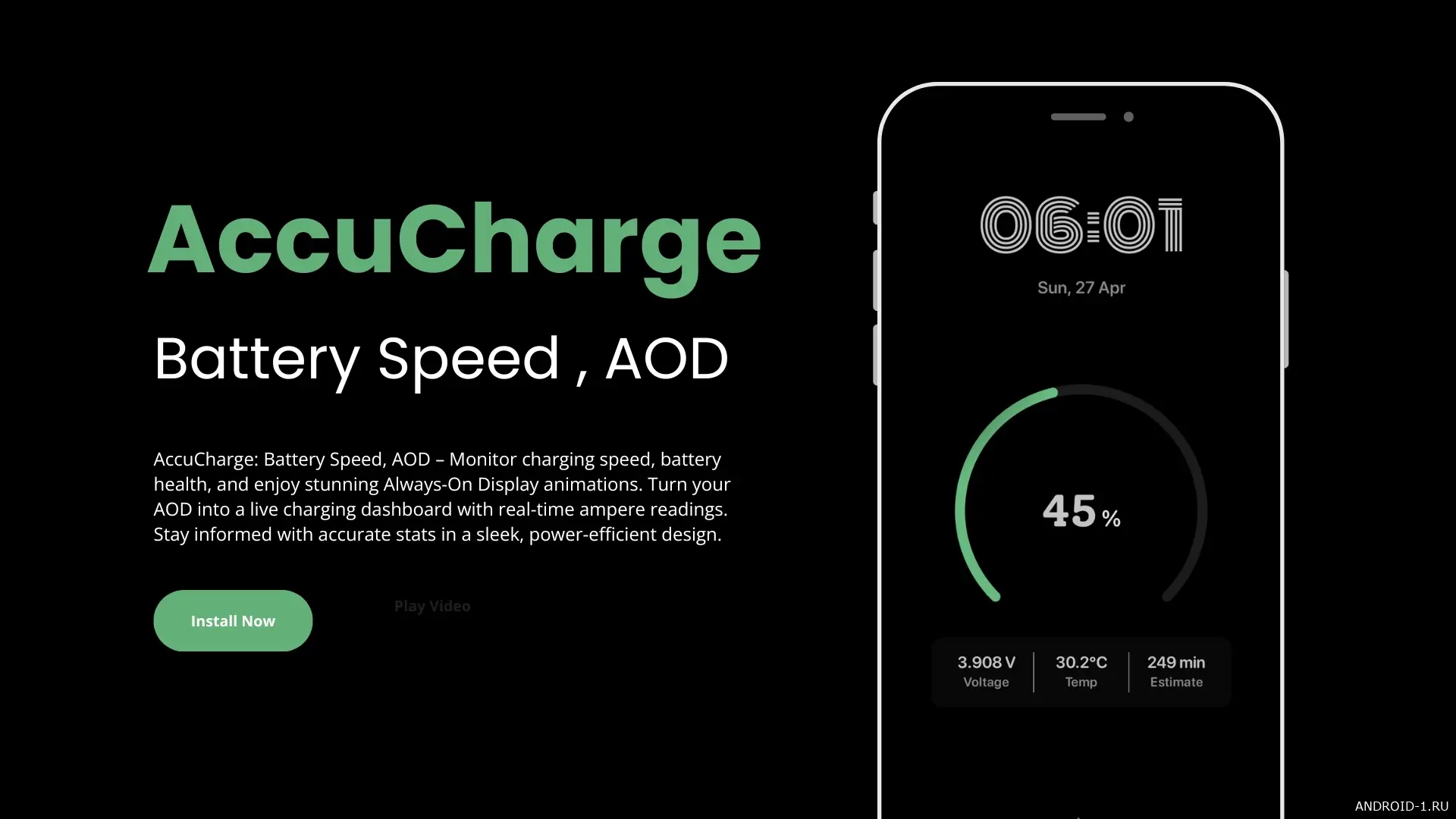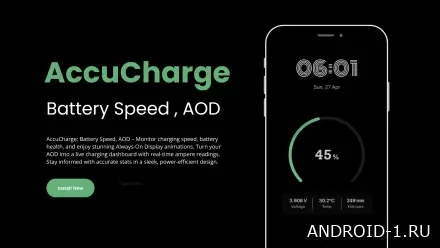 v57.0AccuCharge: Battery Speed, AOD — это удобное приложение для управления батареей которое помогает быстро и точно контролировать процесс зарядки. Ты открываешь приложение и сразу видишь подробную информацию о текущем состоянии батареи времени до полной зарядки и скорости зарядки. За пять минут ты можешь настроить отображение данных на экране и почувствовать как легко стало следить за аккумулятором без лишних действий.