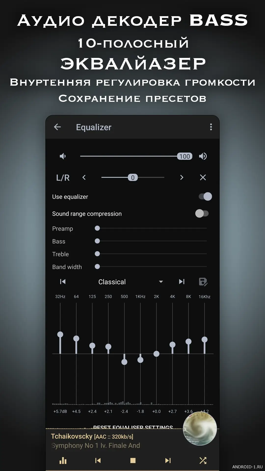 Ты получаешь возможность тонкой настройки звука чтобы каждая нота звучала максимально точно и приятно. Приложение создано для тех кто ценит изысканность и хочет отдыхать под произведения Бетховена Шопена или других мастеров. Ты слушаешь любимые композиции в любое время растешь в спокойствии и наслаждаешься тем как классическая музыка помогает обрести внутреннюю гармонию и тишину. Попробуй сам и почувствуй настоящее удовольствие от прослушивания.