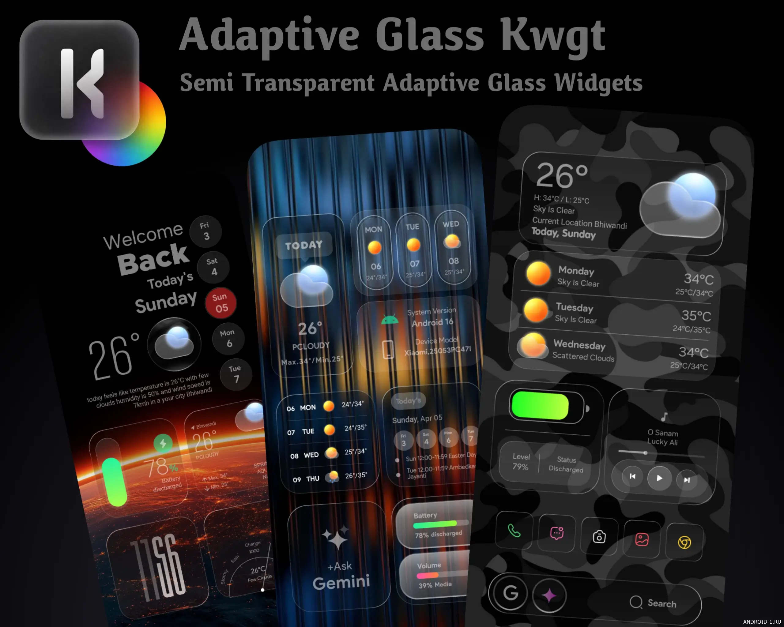 Виджеты выглядят лёгкими, современными и премиальными, при этом остаются максимально функциональными. Вы получаете удобный доступ ко времени, погоде, музыке, уведомлениям и другой важной информации, не перегружая экран. Благодаря модульному дизайну и простым глобальным настройкам вы можете легко комбинировать виджеты по своему вкусу и создавать гармоничную, эстетичную композицию. Если вы хотите, чтобы ваш смартфон выглядел стильно, современно и по-настоящему дорого — Adaptive Glass KWGT станет одним из лучших решений для персонализации.