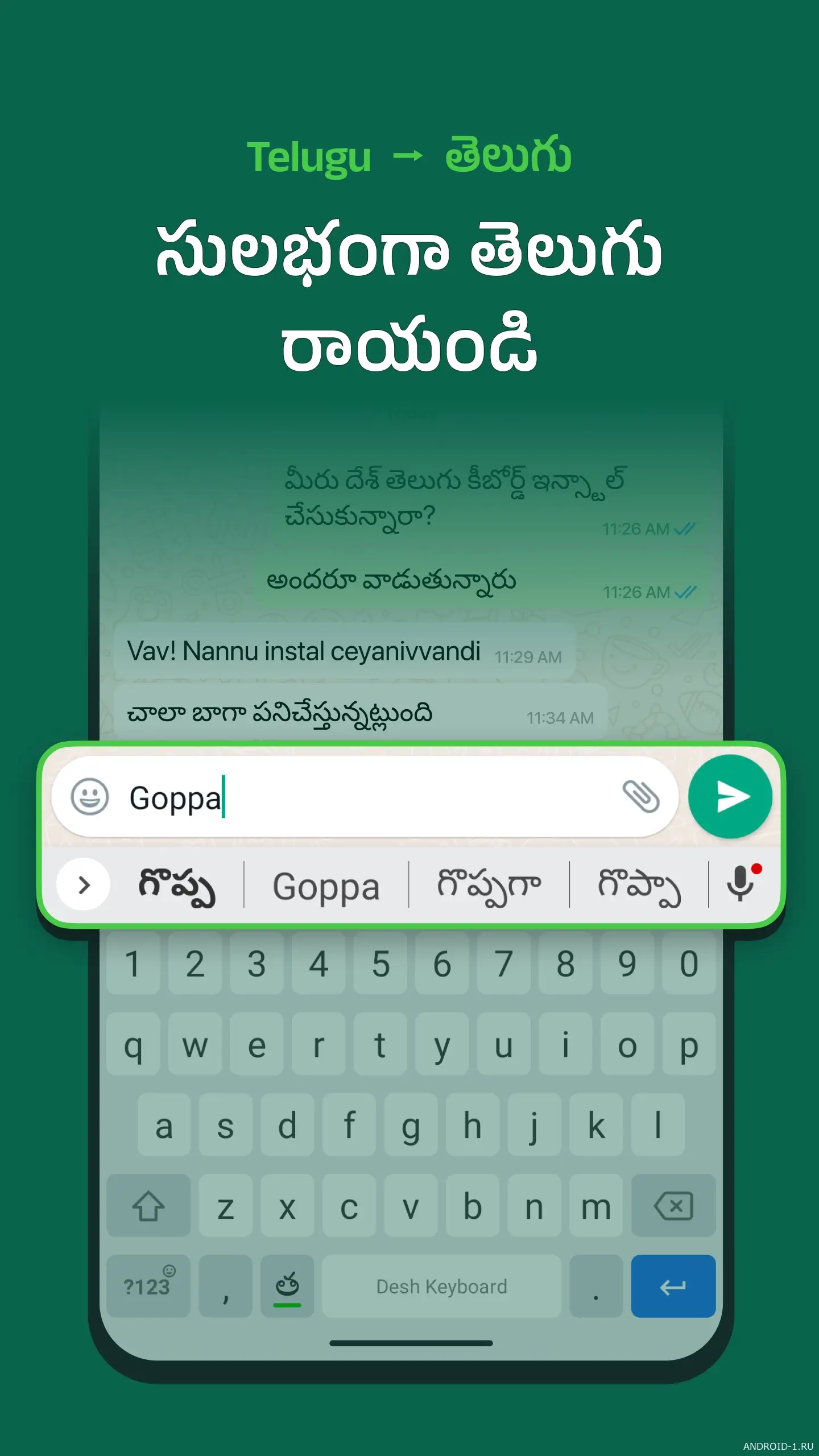 v17.2.5Desh Telugu Keyboard — это современная и очень удобная клавиатура, созданная специально для тех, кто пишет на телугу. Она решает главную проблему — сложность традиционного ввода, позволяя печатать на телугу привычным английским стилем. Ты просто набираешь текст так, как тебе удобно, а приложение умно и быстро преобразует его в правильные символы телугу. Благодаря этому набор текста становится значительно быстрее и приятнее.