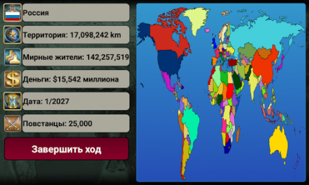 Мирова Империя 2027 (Мод, Много денег) - Мировой порядок в 2027 году терпит полный крах, все сражаются за ресурсы все альянсы распались на мелкие кусочки. В вашей стране был свергнут президент, теперь страной будут править ваши повстанцы, а вы будете их главарём, огромная страна теперь только в ваших руках. Новый парламент одобрил решение о том что бы назначить вас новым главой страны.