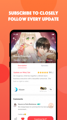 MangaToon обещает вам моменты релаксации и удовольствия, погружая вас в захватывающий мир манги. С его помощью вы сможете насладиться разнообразным контентом, включая романтические истории, боевики, фэнтези и многое другое. Благодаря простому и удобному интерфейсу приложения, вы сможете легко находить и читать свои любимые манги в любое время и в любом месте.
