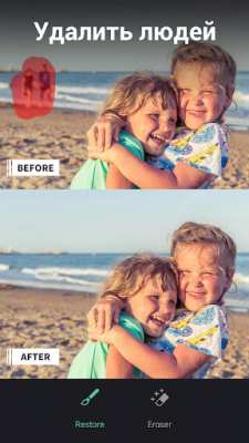 - Редактор изображений, который позволяет просто кончиком пальца удалять ненужные элементы с ваших фотографий. Удалите нежелательное, сотрите нежелательные наклейки и надписи.