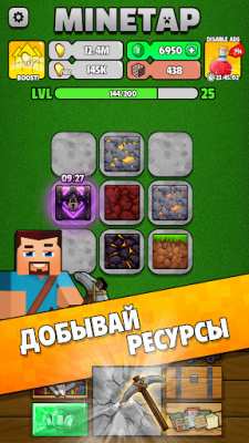 Minetap – Merge кликер - Это увлекательный кликер с механикой соединения блоков и крафтом. Если вы хотите отдохнуть и хорошенько расслабится, то эта игра идеально вам подойдёт. Вам предстоит заняться совмещением одинаковых ресурсов на игровом поле, кроме того, вы будете постоянно создавать более сложные материалы.