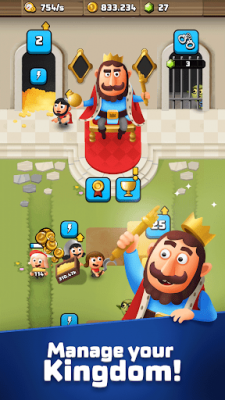 Idle King Clicker Tycoon Games - стратегическая игра, в которой игроки начинают развивать целое королевство. Который попал в серьезную беду, подвергся разрушительной атаке. Кроме того, был похищен наследник престола, а сами подданные теперь до глубины души потрясены происходящим. Игрокам срочно необходимо навести порядок, восстановить человеческое здравомыслие, организовать добычу ресурсов и выращивание сельскохозяйственных культур, создать систему укреплений и собрать новую армию. Потому что трудности и опасности еще не закончились. Перед эпическим размахом - раунд сражений и достижений.