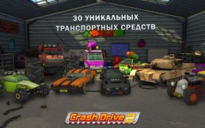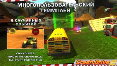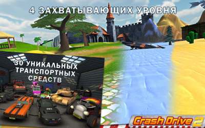 Основной акцент в Crash Drive 2 делается на столкновениях и безудержном веселье. Вы сможете участвовать в гонках по пересеченной местности, выполнять трюки, соревноваться с другими игроками и создавать собственные события для выполнения заданий и заработка очков.